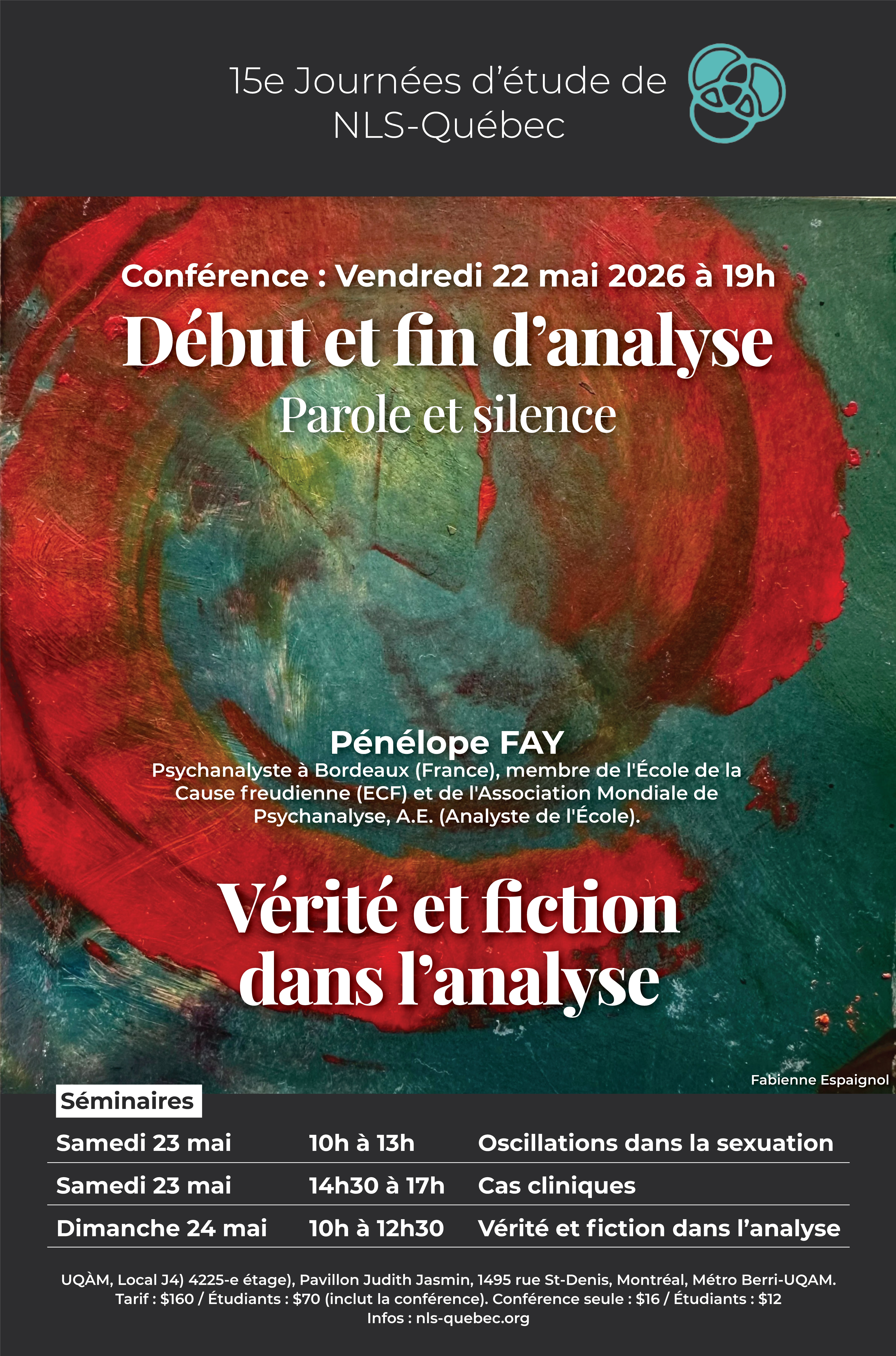 - Séminaire clinique : samedi 23 mai de 14h30 à 17h: Présentation de deux cas cliniques par Miguel Tremblay (travailleur social, psychothérapeute à la clinique externe de psychiatrie de Cartierville à Montréal) et Alicia Lafortune (intervenante psychosociale chez Club Ami et intervenante clinique au centre de crise IRIS), cas commentés par Pénélope Fay.